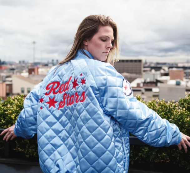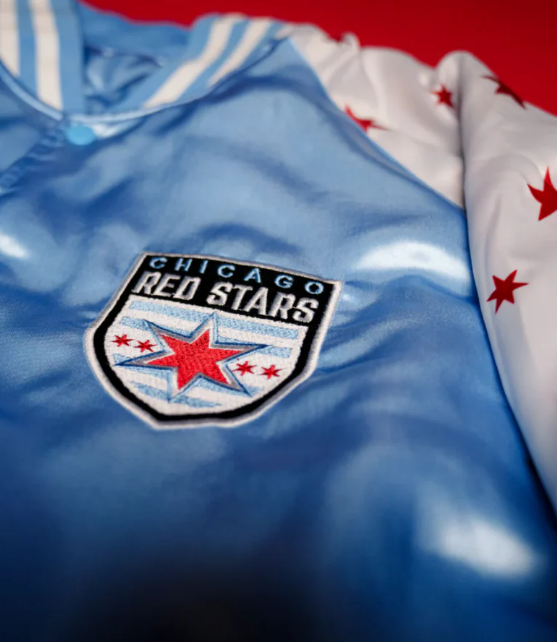 The Chicago Red Stars are a professional women's soccer team in the NWSL. Here I was asked to help create a reversible satin jacket for them, with a quilted, one color exterior, and an interior with red star patterned sleeves!